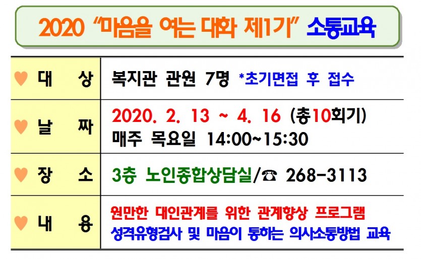 2020년 '마음을 여는 대화 1기' 소통교육 안내 페이지 정보 작성자 관리자 댓글 0건 조회Hit 771회 작성일Date 20-02-11 17:18 본문 2020년 '마음을 여는 대화 1기' 소통교육 안내 목록 댓글목록 댓글목록 등록된 댓글이 없습니다.