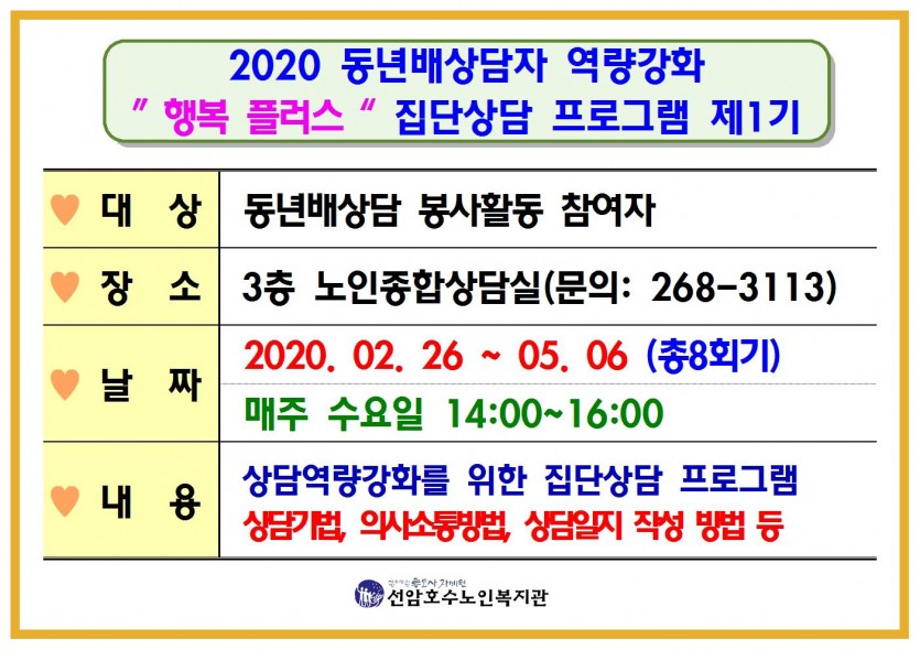 2020년 동년배상담자 역량강화 "행복 플러스" 집단상담 프로그램 실시안내