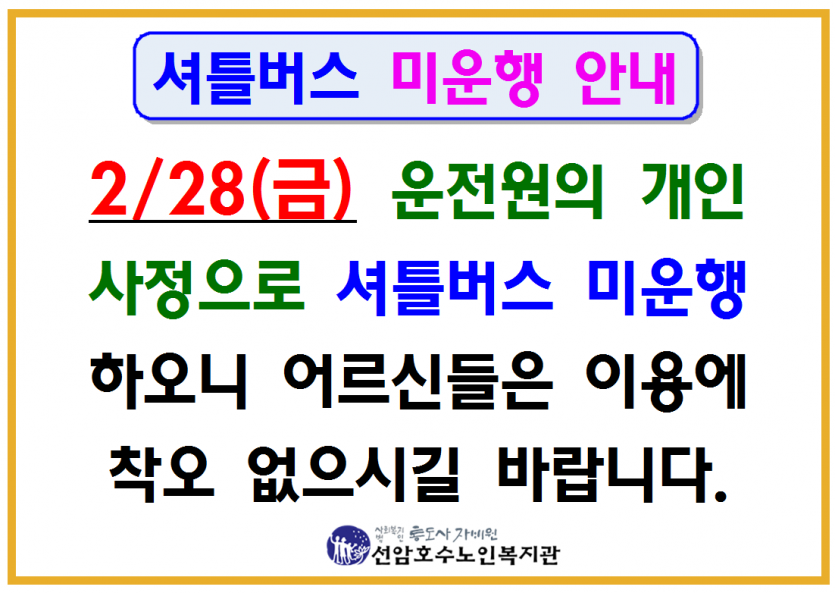 2/28(금) 셔틀버스 미운행 안내 페이지 정보 작성자 관리자 댓글 0건 조회Hit 664회 작성일Date 20-02-21 15:49 본문 2/28(금) 셔틀버스 미운행 안내 목록 댓글목록 댓글목록 등록된 댓글이 없습니다.