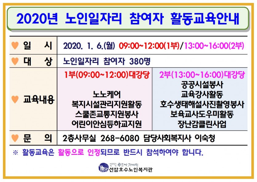 2020년 노인일자리 사업 참여자 활동교육 안내 페이지 정보 작성자 관리자 댓글 0건 조회Hit 863회 작성일Date 20-01-03 09:49 본문 2020년 노인일자리 사업 참여자 활동교육 안내 목록 댓글목록 댓글목록 등록된 댓글이 없습니다.