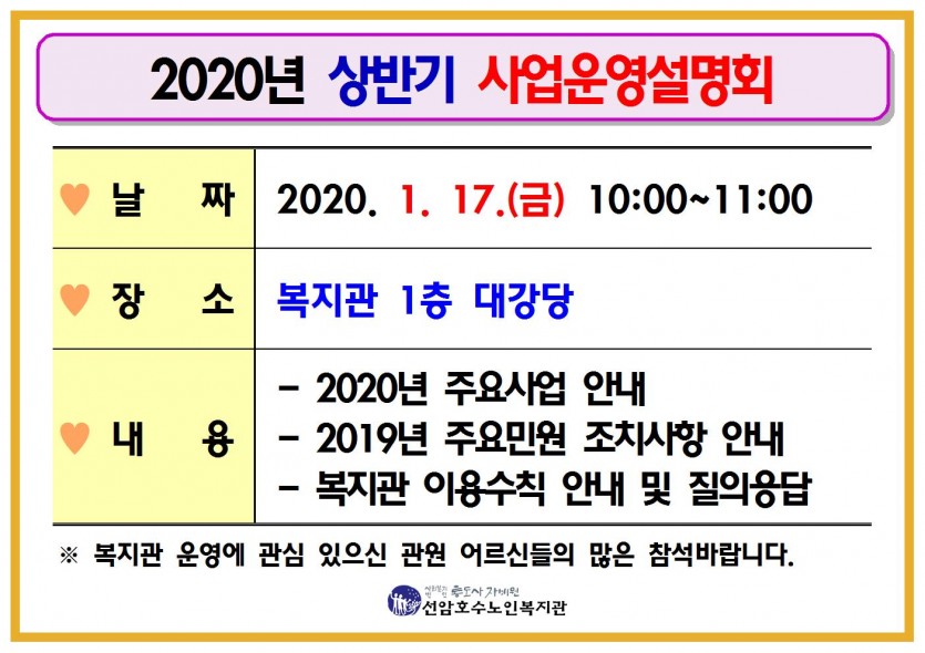 2020년 상반기 사업운영설명회 페이지 정보 작성자 관리자 댓글 0건 조회Hit 685회 작성일Date 20-01-08 07:56 본문 2020년 상반기 사업운영설명회 목록 댓글목록 댓글목록 등록된 댓글이 없습니다.