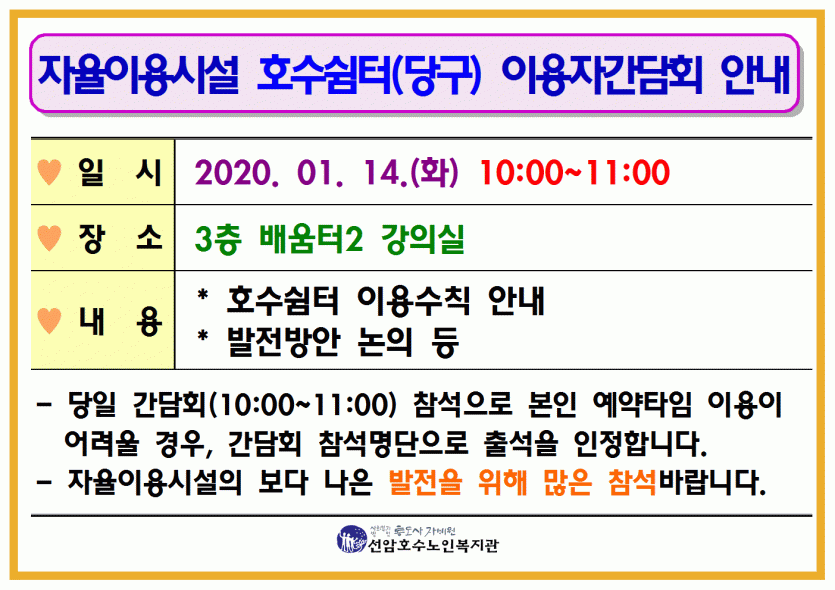 2020년 1월 자율이용시설 호수쉼터(당구) 이용자간담회 안내 페이지 정보 작성자 관리자 댓글 0건 조회Hit 794회 작성일Date 20-01-09 17:21 본문 2020년 1월 자율이용시설 호수쉼터(당구) 이용자간담회 안내 목록 댓글목록 댓글목록 등록된 댓글이 없습니다.