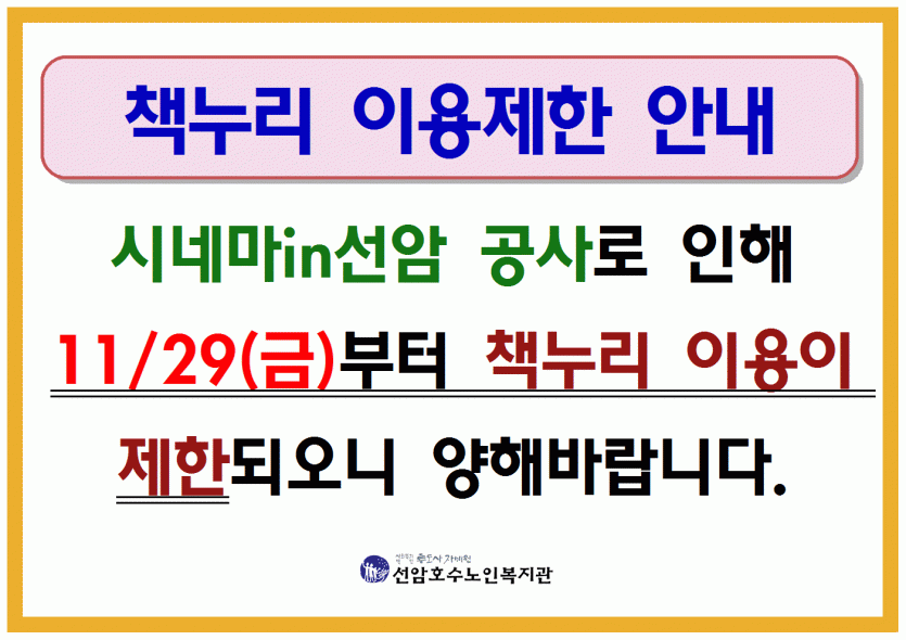 책누리 이용제한 안내 페이지 정보 작성자 관리자 댓글 0건 조회Hit 730회 작성일Date 19-11-28 15:17 본문 책누리 이용제한 안내 목록 댓글목록 댓글목록 등록된 댓글이 없습니다.