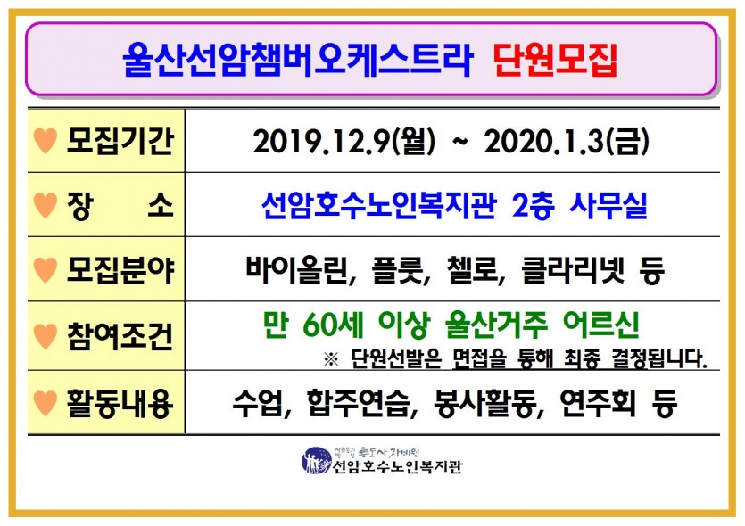 2020년 울산선암챔버오케스트라 단원모집 안내 페이지 정보 작성자 관리자 댓글 0건 조회Hit 751회 작성일Date 19-12-10 16:29 본문 2020년 울산선암챔버오케스트라 단원모집 목록 댓글목록 댓글목록 등록된 댓글이 없습니다.