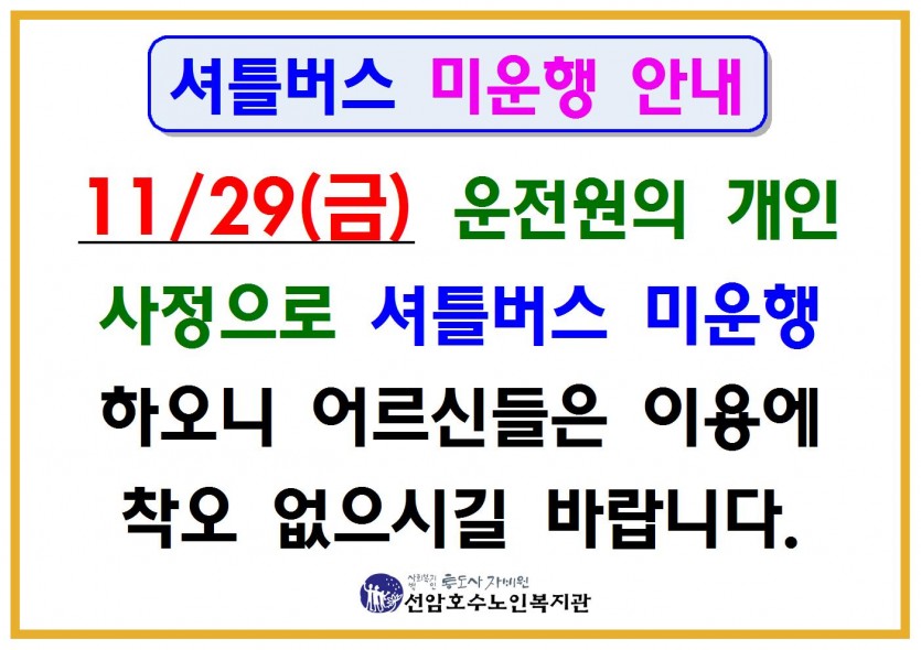 11/29(금) 셔틀버스 미운행 안내 페이지 정보 작성자 관리자 댓글 0건 조회Hit 617회 작성일Date 19-11-26 12:45 본문 11/29(금) 셔틀버스 미운행 안내 목록 댓글목록 댓글목록 등록된 댓글이 없습니다.