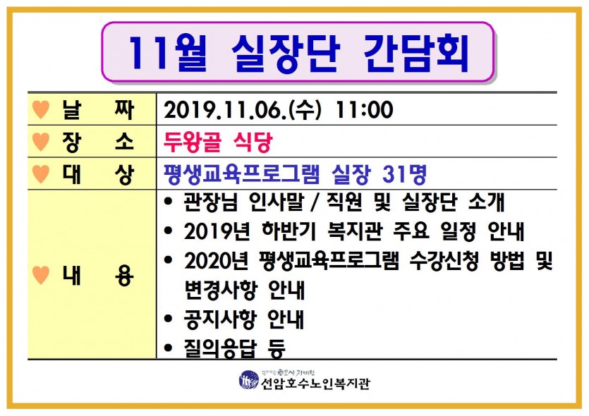 2019년 11월 실장단 간담회 페이지 정보 작성자 관리자 댓글 0건 조회Hit 741회 작성일Date 19-10-28 11:52 본문 2019년 11월 실장단 간담회 목록 댓글목록 댓글목록 등록된 댓글이 없습니다.