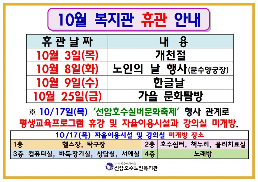 10월 복지관 휴관 [2019-10-01] 페이지 정보 작성자 관리자 댓글 0건 조회Hit 698회 작성일Date 19-10-04 12:02 본문 10월 복지관 휴관 목록 댓글목록 댓글목록 등록된 댓글이 없습니다.