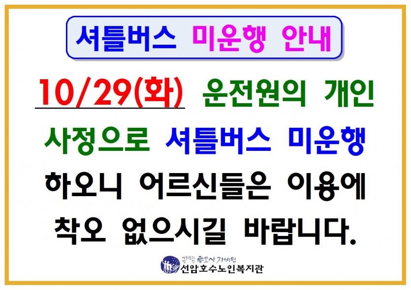 10/29(화) 셔틀버스 미운행 안내 페이지 정보 작성자 관리자 댓글 0건 조회Hit 664회 작성일Date 19-10-22 10:36 본문 10/29(화) 셔틀버스 미운행 안내 목록 댓글목록 댓글목록 등록된 댓글이 없습니다.
