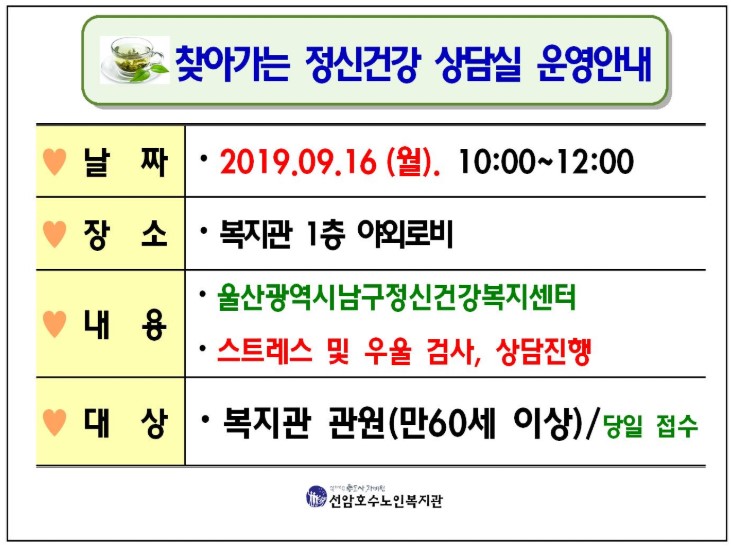 찾아가는 정신건강 상담실 "다가가다" 실시안내 [2019-09-11]