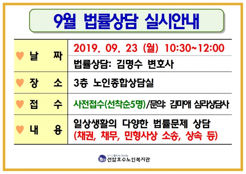 2019년 9월 무료 법률상담 실시안내 [2019-09-18] 페이지 정보 작성자 관리자 댓글 0건 조회Hit 663회 작성일Date 19-10-04 11:49 본문 2019년 9월 무료 법률상담 실시안내 목록 댓글목록 댓글목록 등록된 댓글이 없습니다.