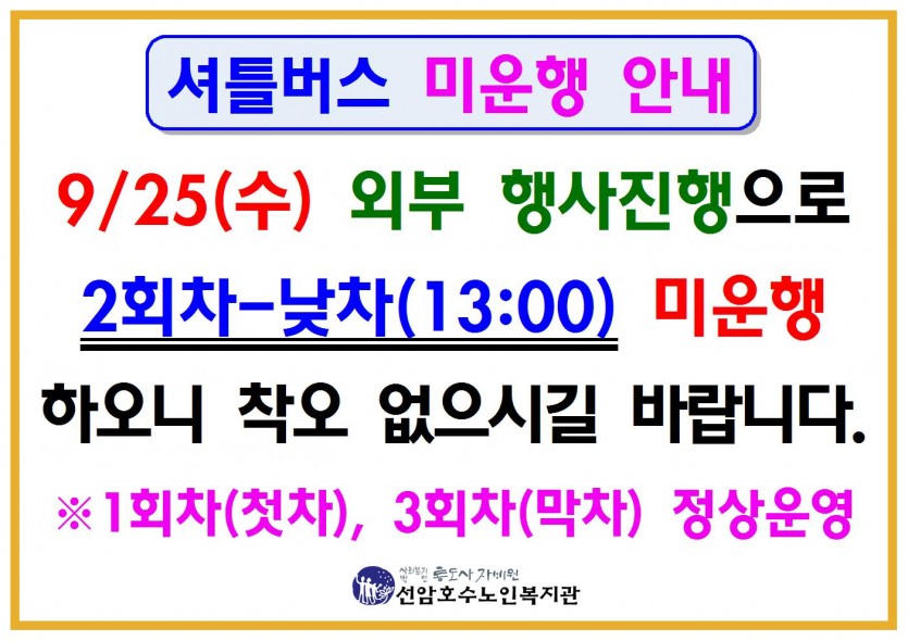 9/25(수) 셔틀버스 미운행 안내 [2019-09-19] 페이지 정보 작성자 관리자 댓글 0건 조회Hit 597회 작성일Date 19-10-04 11:51 본문 9/25(수) 셔틀버스 미운행 안내 목록 댓글목록 댓글목록 등록된 댓글이 없습니다.