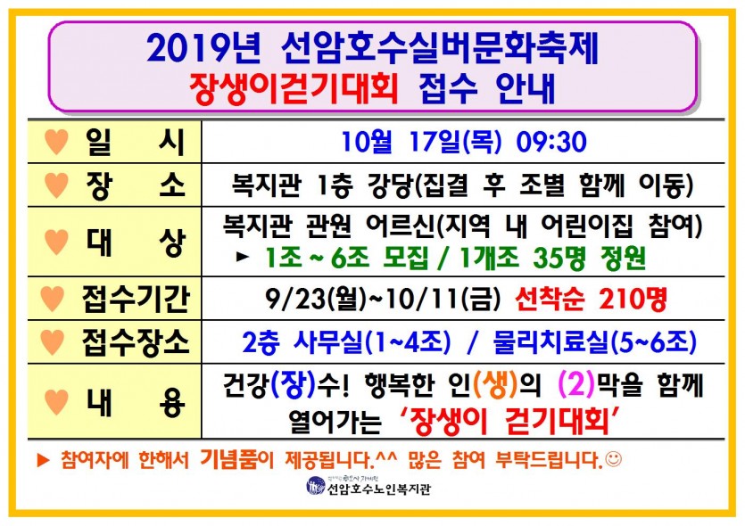 2019년 선암호수실버문화축제 장생이걷기대회 접수 안내