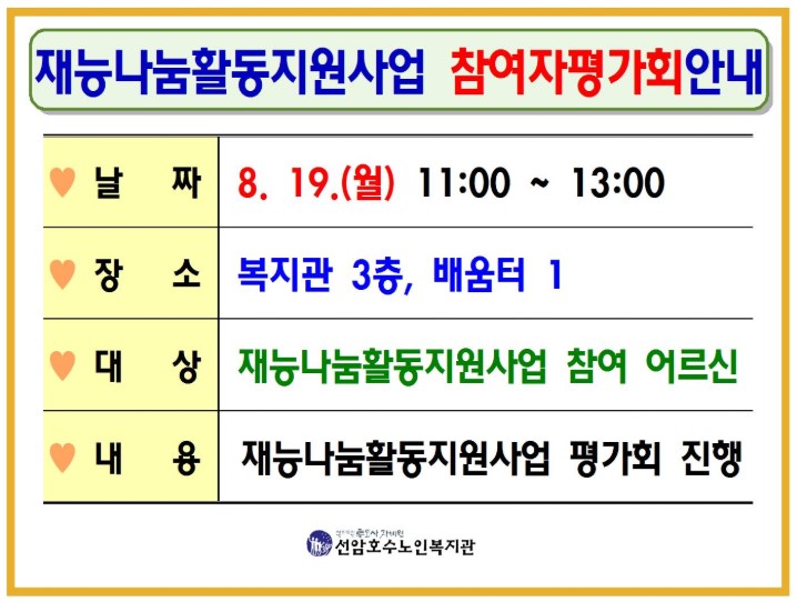 2019년 노인재능나눔활동지원사업 평가회 실시 안내 [2019-08-05]