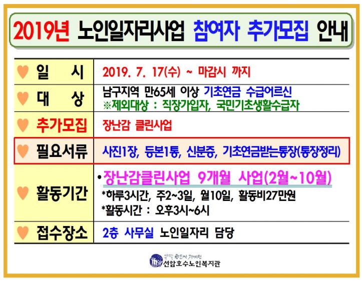2019년 노인일자리사업 참여자 추가모집 안내 [2019-07-17]