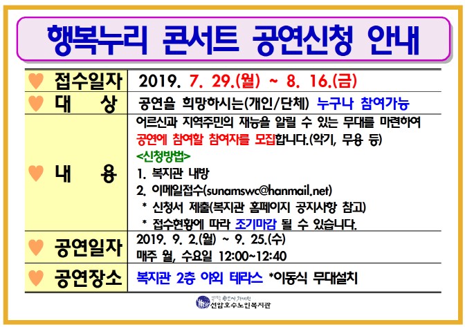 2019 하반기 행복누리 콘서트 공연팀모집 안내 [2019-07-22]