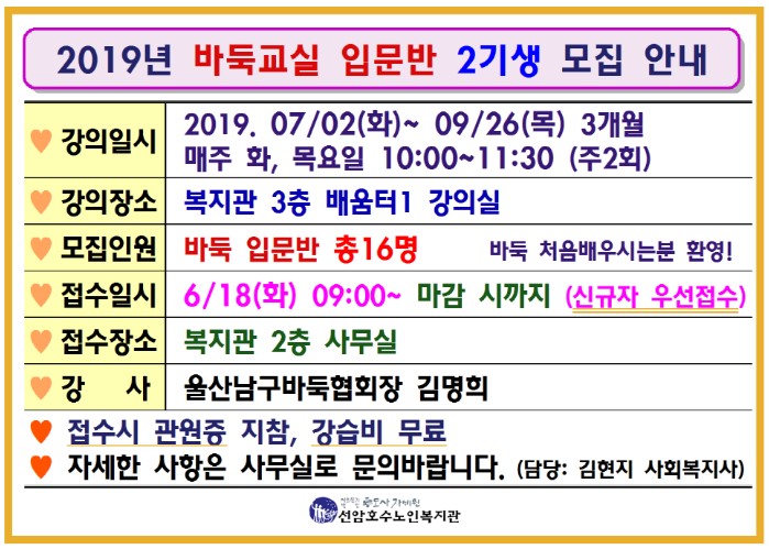2019년 바둑교실 입문반 2기생 모집 안내 [2019-06-11]