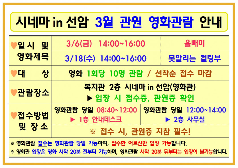 시네마in선암 3월 관원 영화관람 안내 페이지 정보 작성자 선암호수노인복지관 댓글 0건 조회Hit 80회 작성일Date 26-02-26 11:13 본문 시네마in선암 3월 관원 영화관람 안내 목록 댓글목록 댓글목록 등록된 댓글이 없습니다.