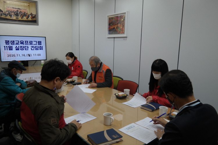 2020.11.16(월) 11시, 복지관 2층 회의실에서 평생교육프로그램의 운영 전반에 대한 정보를 공유하고 프로그램 질적 향상을 위해 '평생교육프로그램 11월 실장단 간담회'를 실시했습니다.