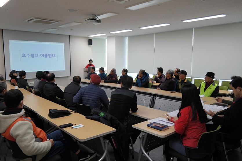평소 호수쉼터(당구장)에 애정과 관심을 갖고 이용해주시는 관원어르신들을 모시고 호수쉼터 이용안내, 공지사항, 지난 간담회 안건 논의결과, 발전방향 논의 및 질의응답시간을 가졌습니다. 자율이용시설 및 호수쉼터의 발전을 위해 다양한 의견을 내주심에 감사드립니다.
