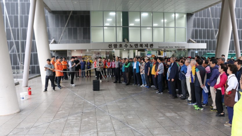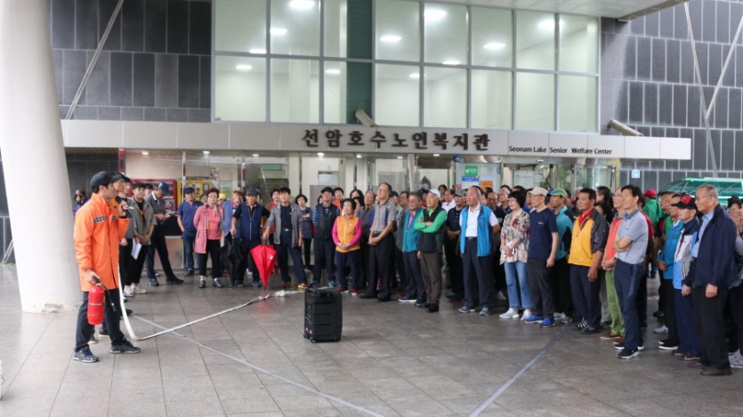 2019년 10월 02일(수), 선암호수노인복지관에서 여천119안전센터와 함께 2019년 합동소방(대피)훈련을 진행하였습니다. 3층 화재 상황 발생으로 인한 긴급 조치 및 피난 훈련을 실시하였고, 상황 종료 후 옥내소화전 및 소화기 사용방법을 시연하였습니다