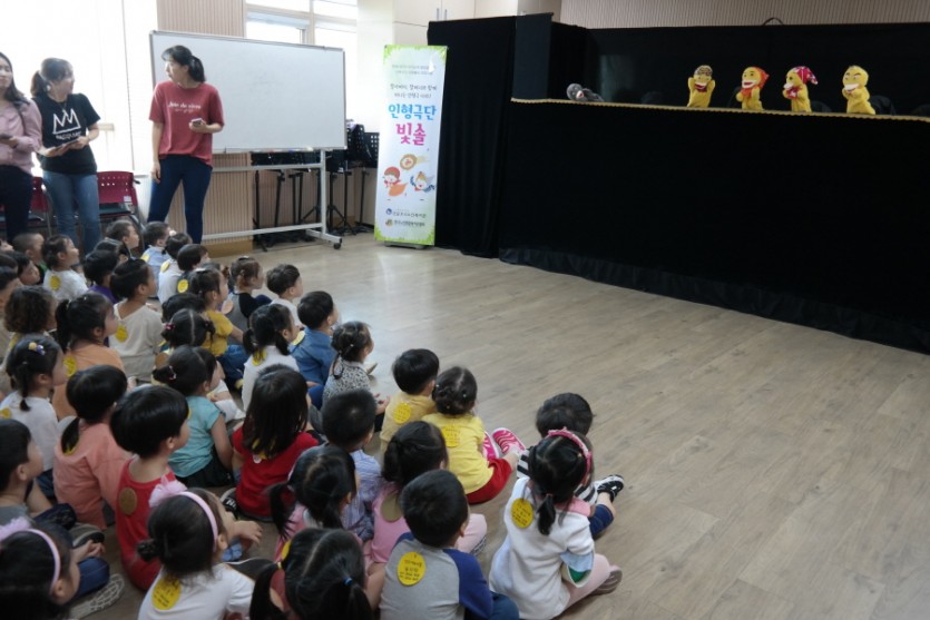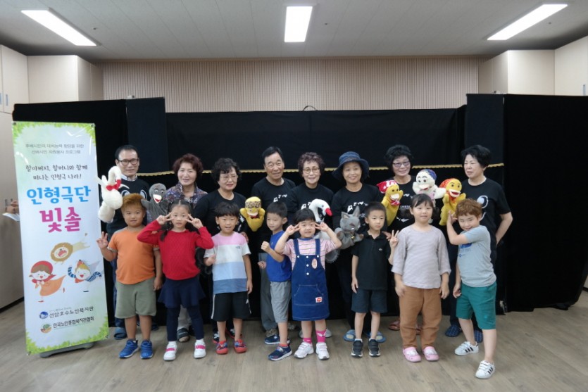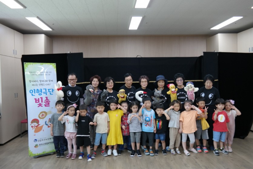 2019년 9월 19일(목) 10:30 선배시민자원봉사프로그램 인형극단 빛솔 이 '꼬모어린이집' 친구들과 복지관 관원을 대상으로 '따돌림예방인형극 - 못난이 아기오리' 를 선보였습니다. 앞으로도 문화 복지 향상과 세대통합을 위해 지역사회 어린이집과 사회복지시설에 인형극 재능기부 공연 봉사활동을 펼치는 '빛솔'의 활약을 기대합니다.