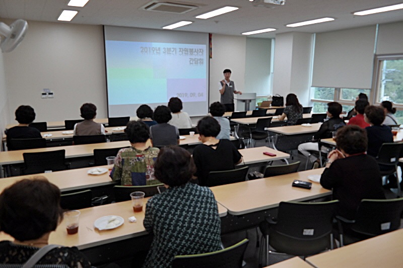 선암호수노인복지관에서는 2019년 9월 4일, 3층 배움터 2에서 3분기 자원봉사자 간담회를 진행하였습니다. 자원봉사 단체장 27명이 참석하여 원활한 자원봉사 활동을 위한 의견 수렴 및 공지사항을 전달하였습니다.