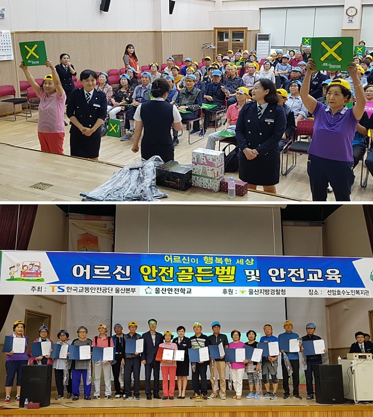2019.08.23(금) 09:30 복지관 1층 대강당에서 한국교통안전공단 울산본부와 울산안전학교 주최로 어르신들의 삶에 활력을 드리고 실력을 겨루며 올바른 안전문화정착에 기여하기 위한 '어르신 골든벨 대회'가 열렸습니다.