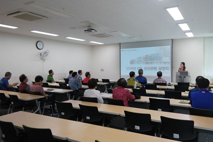 2019년 08월 27일(화) 7~8월 동안 선암호수노인복지관에 신규로 가입한 어르신들을 대상으로 복지관내 지켜야 할 이용 수칙, 자율이용시설 안내등을 통해 건전한 복지관 이용 문화를 형성하고자 신규관원설명회를 실시하였고, 마지막에 질의응답시간도 가져 유익한 시간이였습니다.
