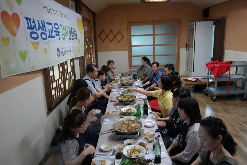 2019.7.24(수) 17:30분, 식당 토지 보리밥에서 2019년 평생교육프로그램 7월 강사 간담회를 실시했습니다. 관장님 인사말씀, 강사소개, 프로그램 진행 시 협조사항, 2019년 하반기 복지관 주요일정 안내, 수강생 전달사항, 유의사항, 질의응답 등의 시간을 갖고, 함께 맛있는 저녁식사를 했습니다. 반별 분위기 및 애로사항 등 강사들 간 수업에 대한 고충과 정보를 공유 할 수 있는 시간이 되었습니다.^^