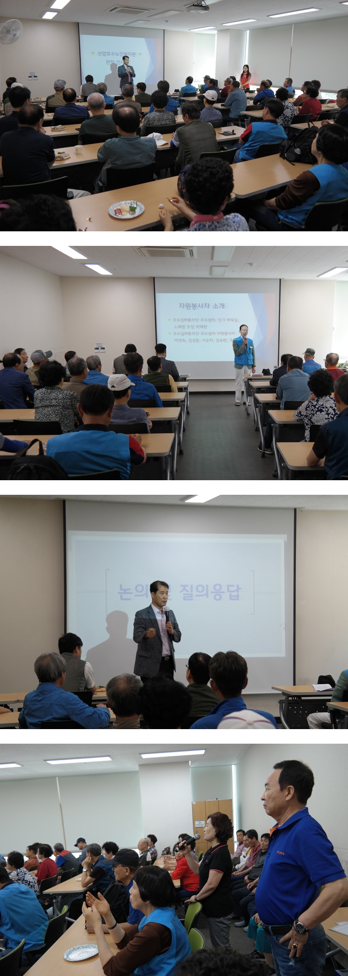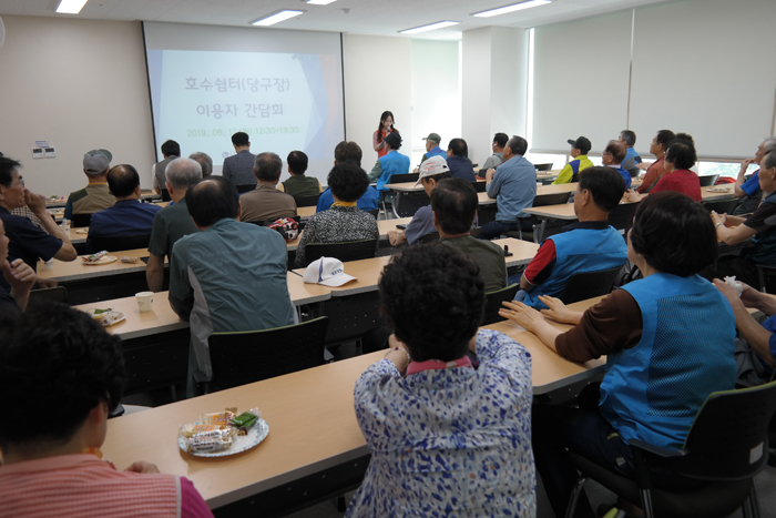 평소 호수쉼터(당구장)에서 열정적인 이용을 해주시는 관원어르신들을 모시고 호수쉼터 이용수칙, 공지사항, 지난 간담회 안건 조치사항, 발전방향 논의 및 질의응답시간을 가졌습니다. 호수쉼터를 이용하면서 느끼신 감정과 발전방향을 위한 소중한 의견에 감사드리며, 금일 안건에 대한 내용은 추후 별도 공지하겠습니다. 이용자 어르신들께 다시한번 감사드립니다.