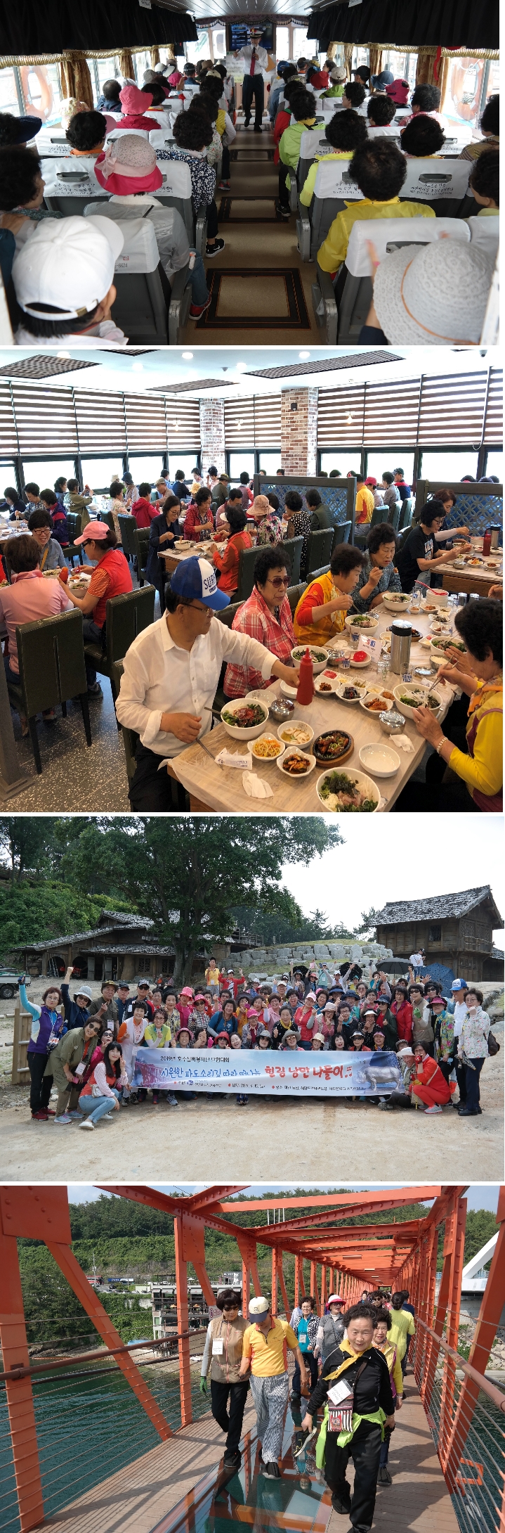 2019년 6월 15일(토), 선암호수노인복지관을 위해 봉사해주시는 노인자원봉사단 ‘호수실버봉사단’의 노고를 위로하고 유대감 강화와 소속감을 고취하고자 마산 돝섬, 해양드라마세트장, 저도연륙교 스카이워크 일대로 단합대회를 다녀왔습니다. 이번 단합대회를 통해 호수실버봉사단원들의 소통과 화합을 도모하는 좋은 기회가 되었습니다.^^