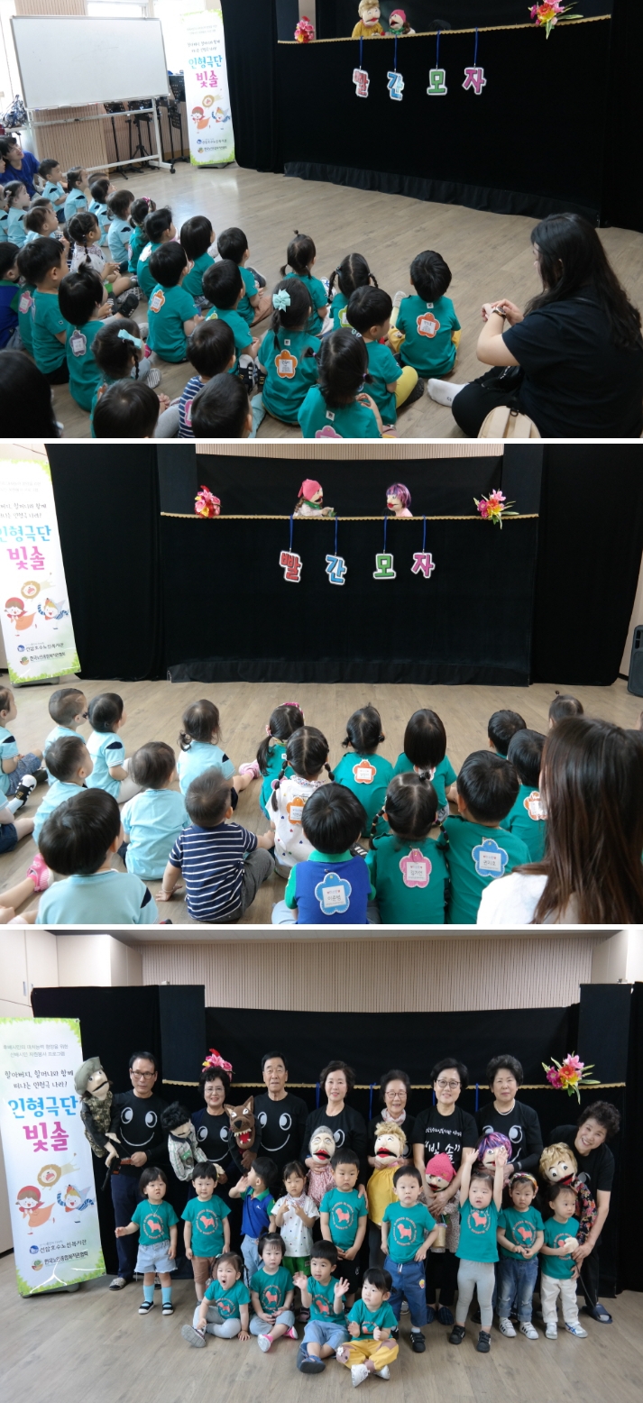 2019년 5월 29일(수) 10:30 인형극단 빛솔 이 '신정3동어린이집, 사과나무어린이집' 친구들과 복지관 관원을 대상으로 '유괴예방인형극 - 따라가면 안돼! 빨간모자야' 를 선보였습니다. 앞으로도 문화 복지 향상과 세대통합을 위해 지역사회 어린이집과 사회복지시설에 인형극 재능기부 공연 봉사활동을 펼치는 '빛솔'의 활약을 기대합니다.