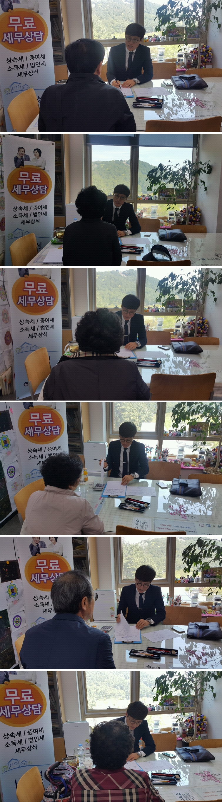 2019년 4월 16일 수요일 3층 노인종합상담실에서 관원 7명을 대상으로 무료 세무 상담을 진행하였습니다. 4월 세무 상담에서는 현금증여의 한도 및 절차, 상속세, 임대사업자의 종합소득세, 토지 증여시 세금 등 증여와 양도소득세에 대한 상담이 진행되었습니다. 세무사님과 1:1 개별상담을 통하여 복잡한 세무문제를 쉽고 원만하게 해결할 수 있도록 돕고 다양한 세무 정보를 제공함으로써 효율적인 자산관리에 많은 도움이 되는 시간이었습니다. 무료로 세무 상담을 진행해주신 김지성 세무사님께 깊이 감사드립니다!!!