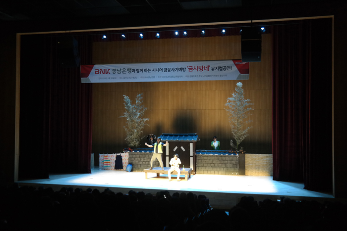 2019.04.18(목) BNK 경남은행 주최로 울산도서관에서 금융사기 유형과 피해의 심각성을 이해하고 예방법에 대한 교육의 일환인 시니어 금융사기피해예방 뮤지컬 '금사방네' 공연을 복지관 관원 80명이 함께 관람했습니다.