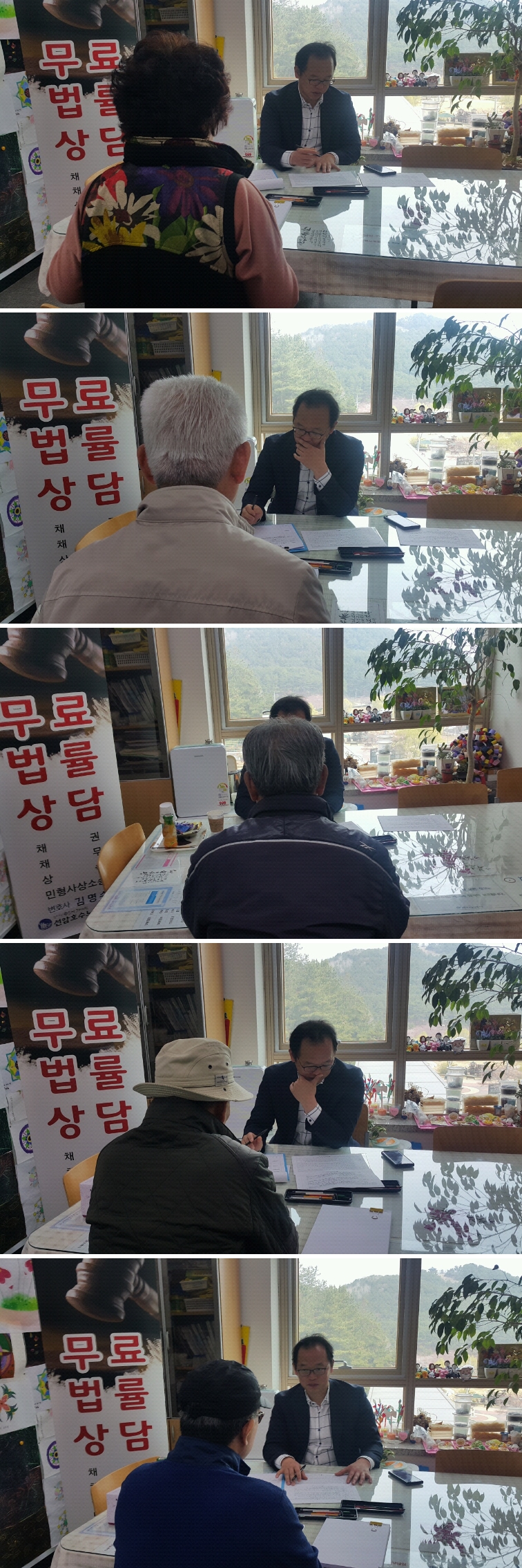 2019년 3월 25일 월요일 3층 노인종합상담실에서 김명수 변호사님과 함께하는 무료법률상담을 진행하였습니다. 법률상담을 신청한 관원 8명은 의료소송, 용도변경 및 분양과 관련된 법적 절차, 제소전 화해조서 등에 대하여 변호사님과 1:1 개별상담을 진행하였으며, 상담을 통하여 일상생활에 필요한 법률정보 및 법적처리절차에 대한 정보를 제공하여 복잡한 법률문제를 쉽고 원만하게 해결할 수 있도록 도움을 주었습니다.