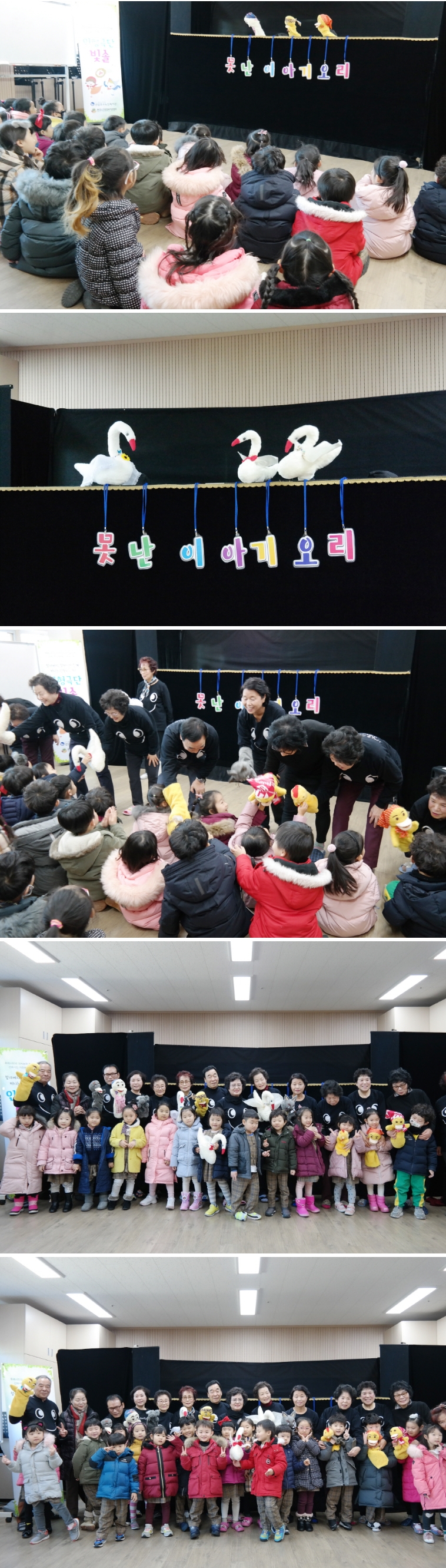 12/27(목), 10:30 인형극단 '빛솔'이 '천사어린이집' 친구들을 대상으로 따돌림예방 인형극 '못난이 아기오리' 를 선보였습니다. 앞으로도 문화 복지 향상과 세대통합을 위해 지역사회 어린이집과 사회복지시설에 인형극 재능기부 공연 봉사활동을 펼치는 '빛솔'의 활약을 기대합니다!