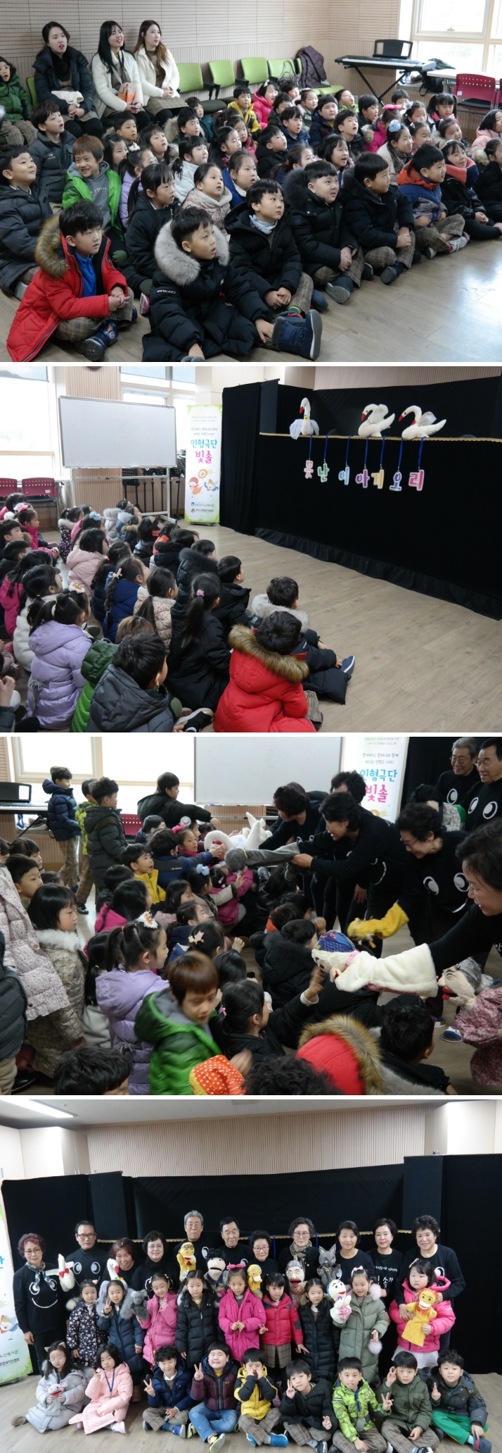 2019년 1월 10일(목) 10:30 인형극단 '빛솔'이 '천사어린이집' 친구들을 대상으로 따돌림예방 인형극 '못난이 아기오리' 를 선보였습니다. 앞으로도 문화 복지 향상과 세대통합을 위해 지역사회 어린이집과 사회복지시설에 인형극 재능기부 공연 봉사활동을 펼치는 '빛솔'의 활약을 기대합니다!