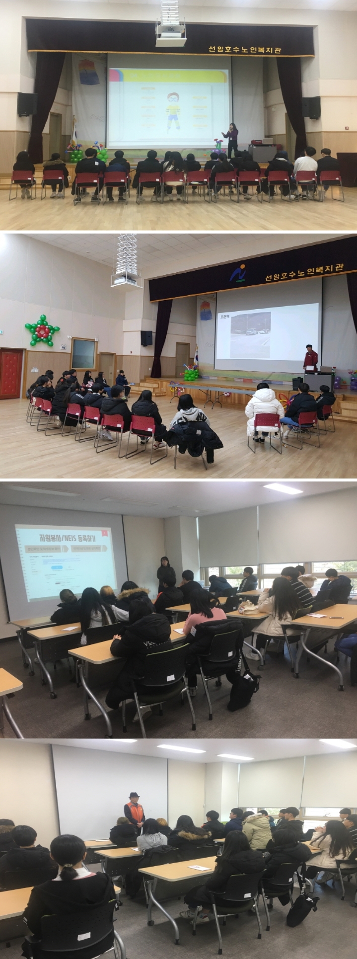 2019년 1월 8일(화)~10일(목), 3일동안 청소년 21명이 선암호수노인복지관에서 청소년자원봉학교 프로그램을 진행하였습니다. 자원봉사의 이해, 복지관 위험요소 찾기, 선배자원봉사자와의 만남, 노인유사체험, 독거어르신 주거지 방문 등 다양한 프로그램으로 유익한 시간을 함께하였습니다.