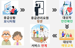 지역사회 예방적 돌봄의 차원에서 상시 보호가 필요한 노인 가구 및 장애인 가구에 게이트웨이, 화재감지기 등을 설치하여 화재, 질병 등 응급상황 발생 시 119에 자동으로 신고하고 응급관리요원에게 알려 대상자가 응급상황에 신속하게 대처하는 지원 체계를 구축합니다.| 독거노인 | 대상 : 주민등록상 거주지와 동거자 유무, 소득과 관계없이 실제로 혼자 살고 있는 65세 이상의 노인 |